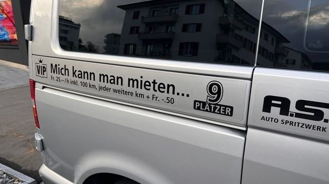 Das Fahrzeug ist Vollkasko versichert. Für Bussen oder Schäden aller Art beträgt der Selbstbehalt CHF 1'000.- + Bonusverlust der Police im Schadenfall, welche bei Übergabe direkt vom Fahrzeuglenker bar bezahlt werden muss. Alle Schadenkosten unter CHF 1'500.- werden zulasten des Fahrzeuglenkers verrechnet. Exkl. Treibstoff. Jede weitere angefangene Stunde CHF 25.-/h inkl. km. Zeitliche Tagespauschale von 9 Stunden